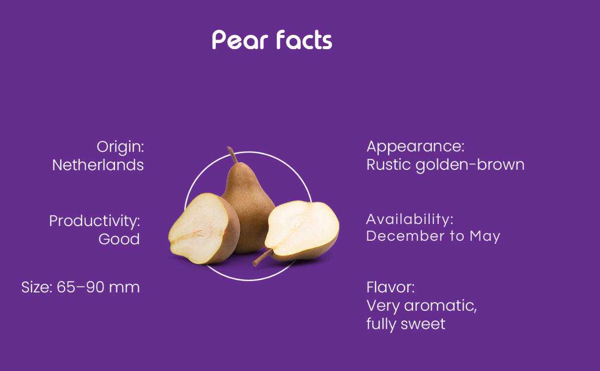 The name says it all: the Dazzling Gold pear is a real eye-catcher. This golden-brown hand pear combines a sturdy look with a rich, full-bodied flavor. Thanks to its firm flesh, it’s not only perfect as a snack pear but also ideal for cooking or stewing.
